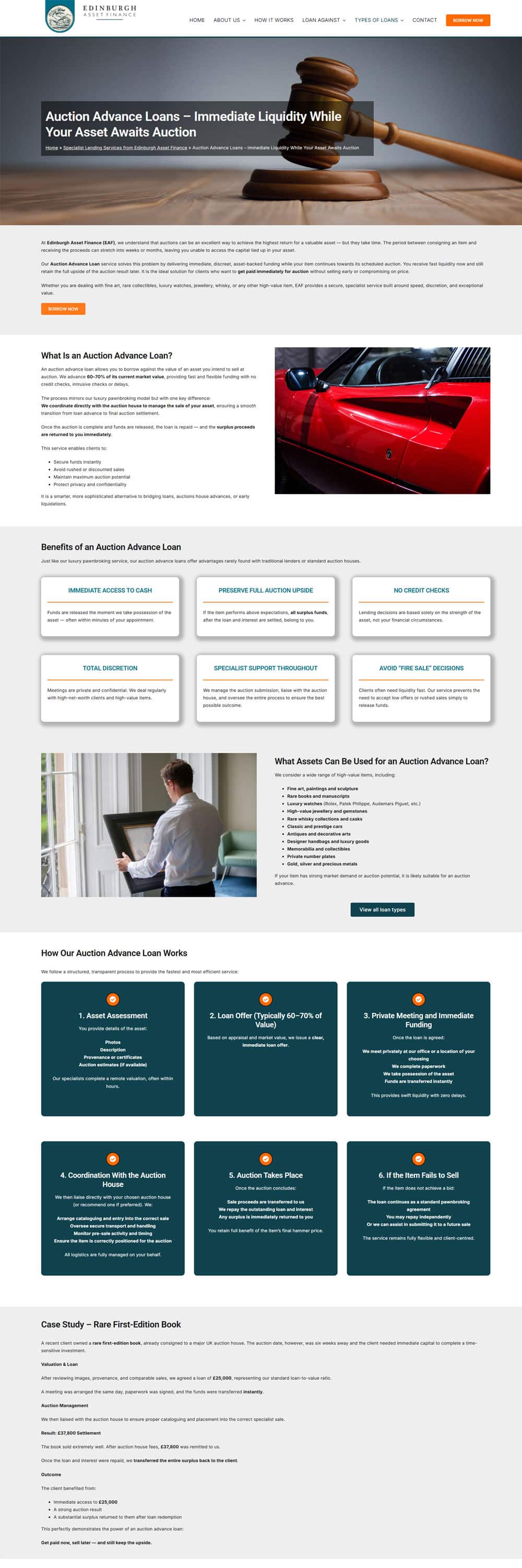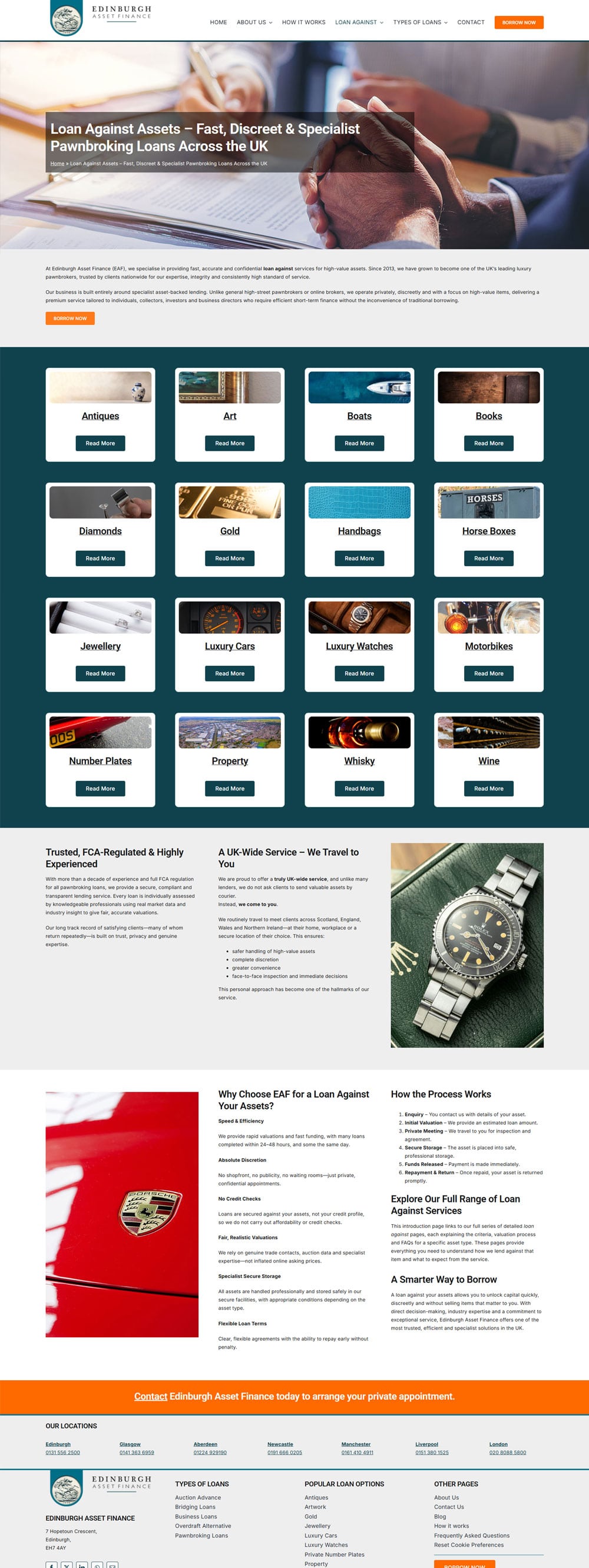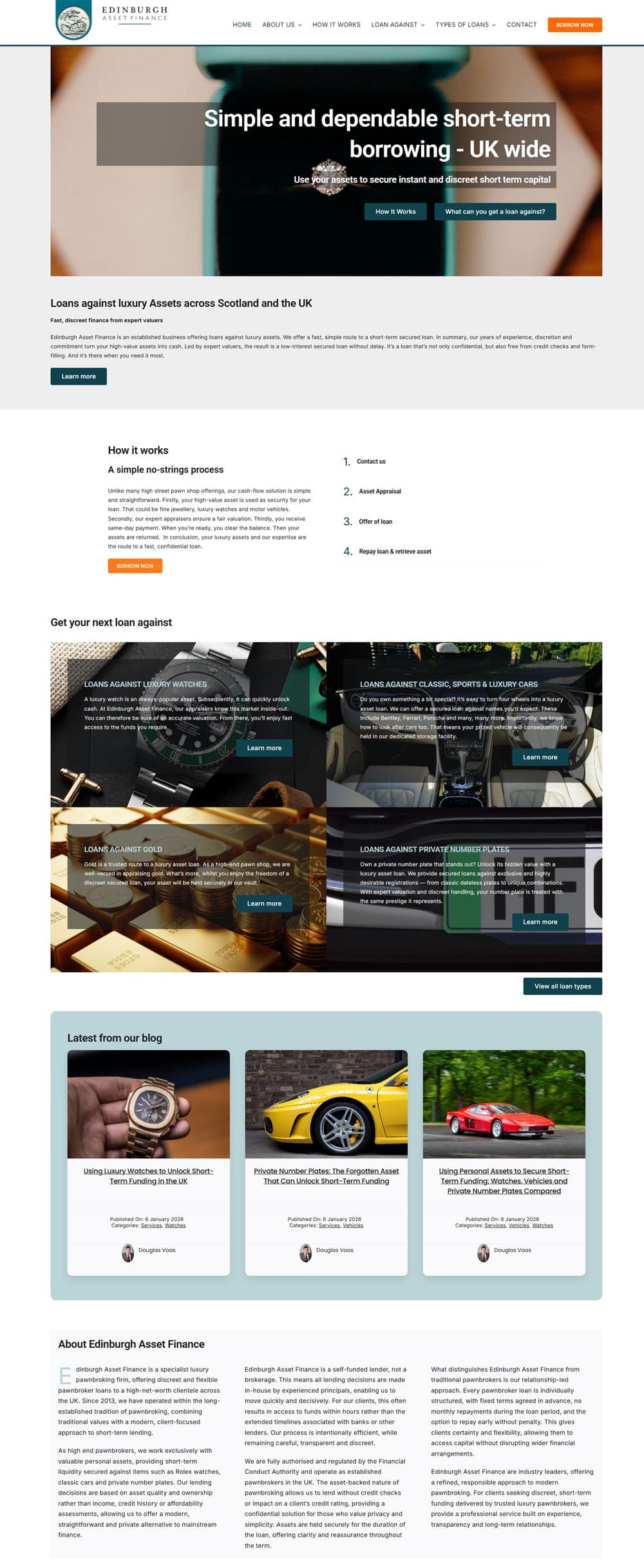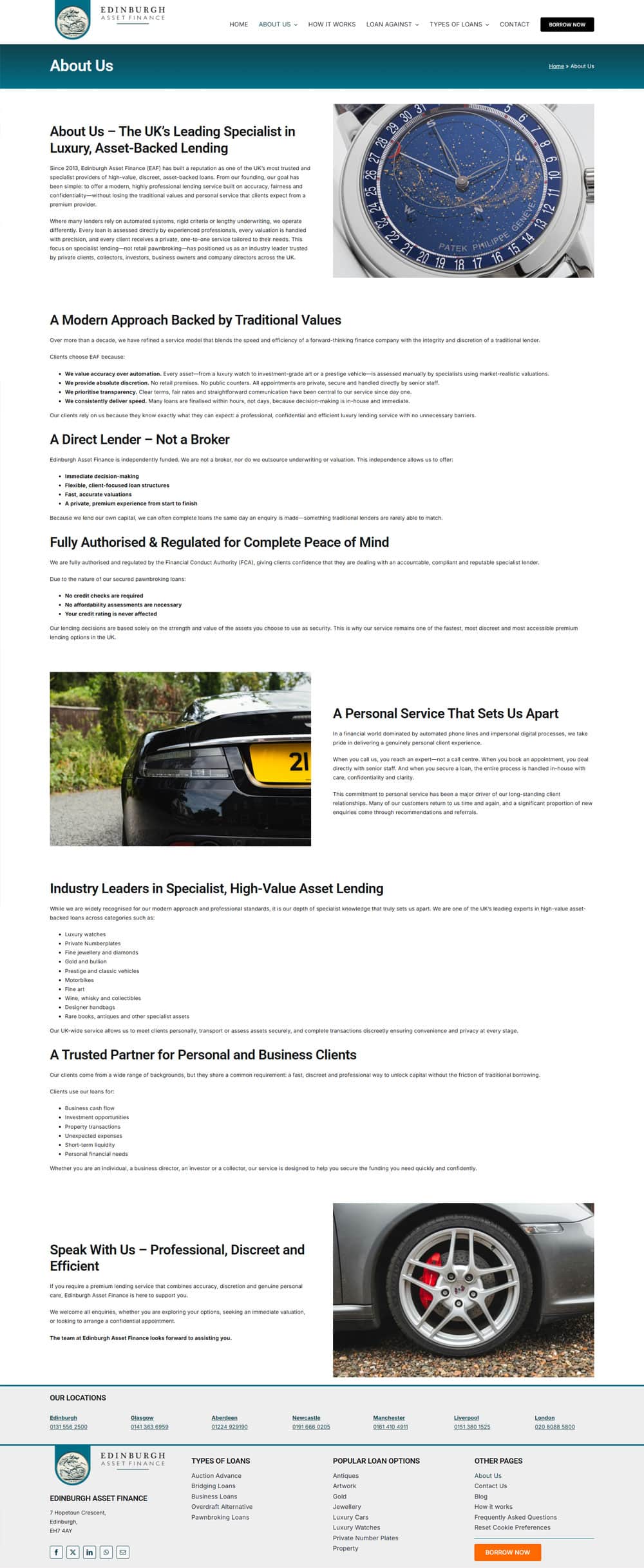 Since 2013, Edinburgh Asset Finance (EAF) has built a reputation as one of the UK’s most trusted and specialist providers of high-value, discreet, asset-backed loans. From their founding, the goal has been simple: to offer a modern, highly professional lending service built on accuracy, fairness and confidentiality—without losing the traditional values and personal service that clients expect from a premium provider.